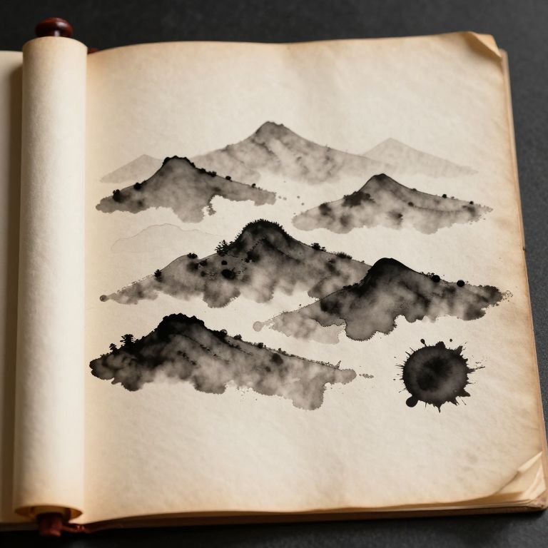A photograph of an open, aged sketchbook with a cream-colored, slightly yellowed page. On the page, there are five black ink splashes of varying sizes and shapes, resembling abstract mountain or cloud formations. The ink splashes are uneven and have a textured, organic appearance. The sketchbook has a brown, wooden binding visible at the top left and bottom right corners. The background is a dark, plain surface, contrasting with the bright page and black ink. The image has a realistic, detailed style, emphasizing the texture of the paper and the ink.