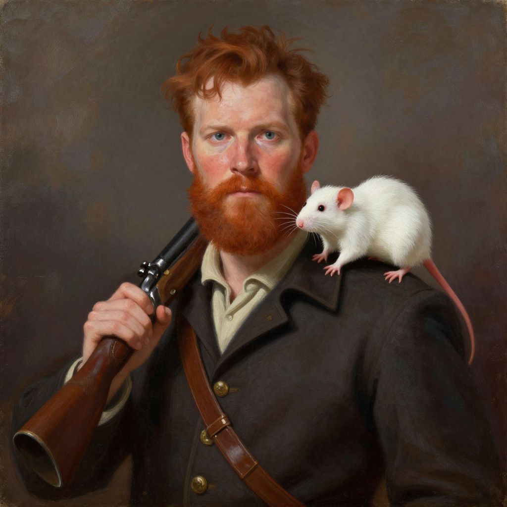 Photorealistic painting of a red-bearded man with white mouse on shoulder, holding rifle, wearing dark coat, brown strap over chest.