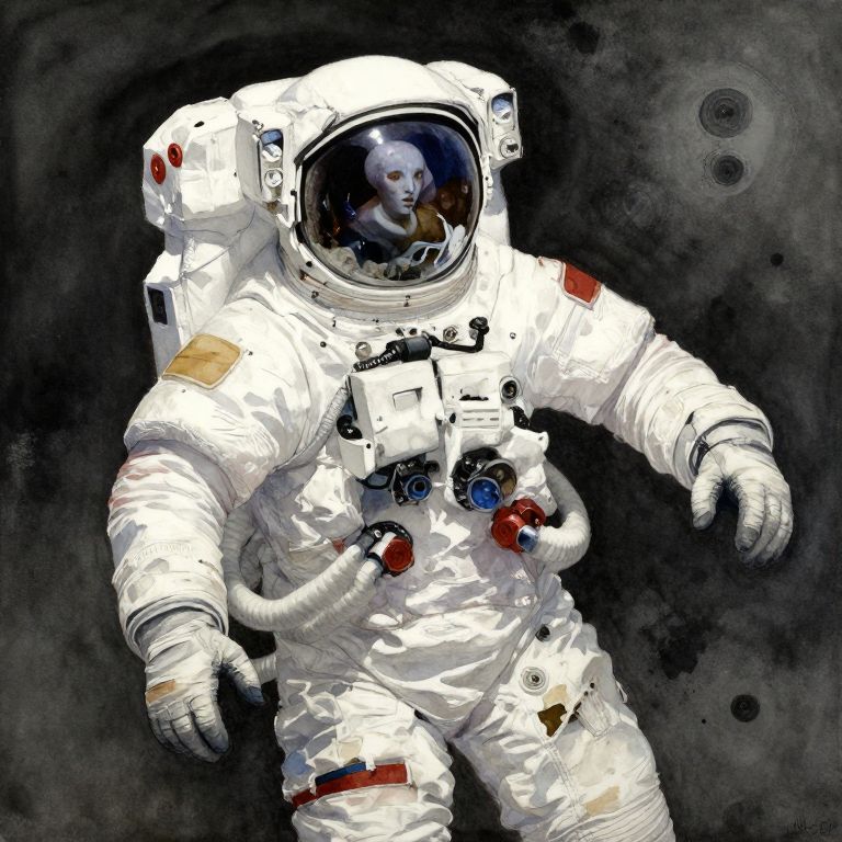 Digital painting of an astronaut floating in space, wearing a white spacesuit with patches, visible face in helmet, dark cosmic background.