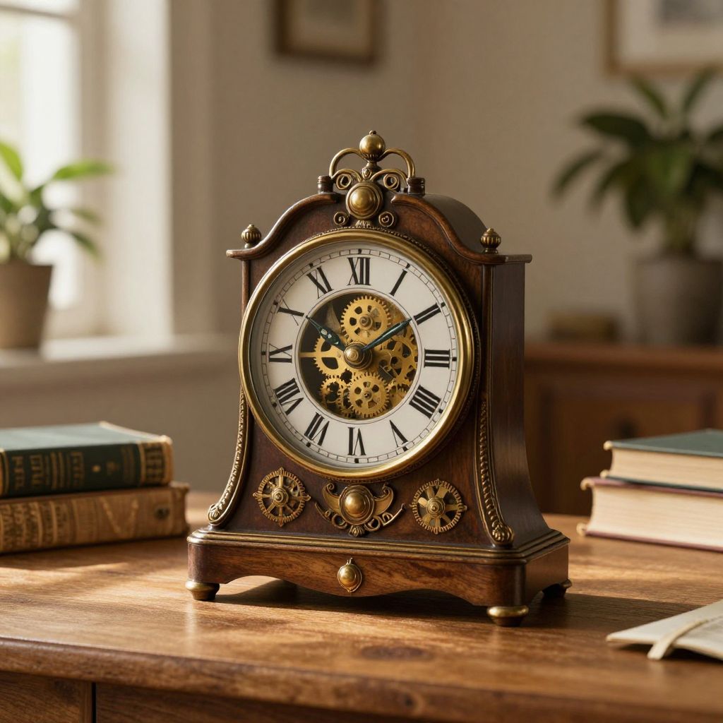 Uhr, a beautifully crafted vintage clock sitting elegantly on a wooden desk, intricate brass gears visible inside, warm sunlight casting soft shadows, cozy room with antique books and plants, hyperrealistic style, detailed textures, warm tones.