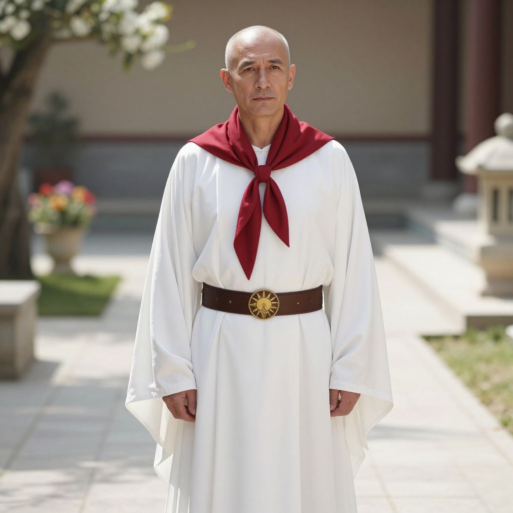A tall, well-dressed male stands in a serene, sunlit courtyard, wearing a flowing white robe that drapes gracefully over his shoulders and chest. A rich red scarf is tied around his neck, adding a bold contrast to the soft white fabric. He is secured with a brown leather belt adorned with a prominent gold emblem that features a stylized sun and an ancient symbol, suggesting wisdom and authority. His expression is calm and composed, with gentle eyes that convey thoughtfulness and experience. The background shows a tranquil landscape of stone pathways and blooming flowers, enhancing the sense of peace and elegance.