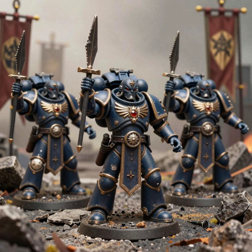 Old primarch models, close-up of intricately sculpted figures with worn edges and chipped paint, standing heroically amidst cracked stone ruins and ancient banners, with a foggy battlefield background, integrating fantasy elements and aged craftsmanship in the depiction of epic tales.