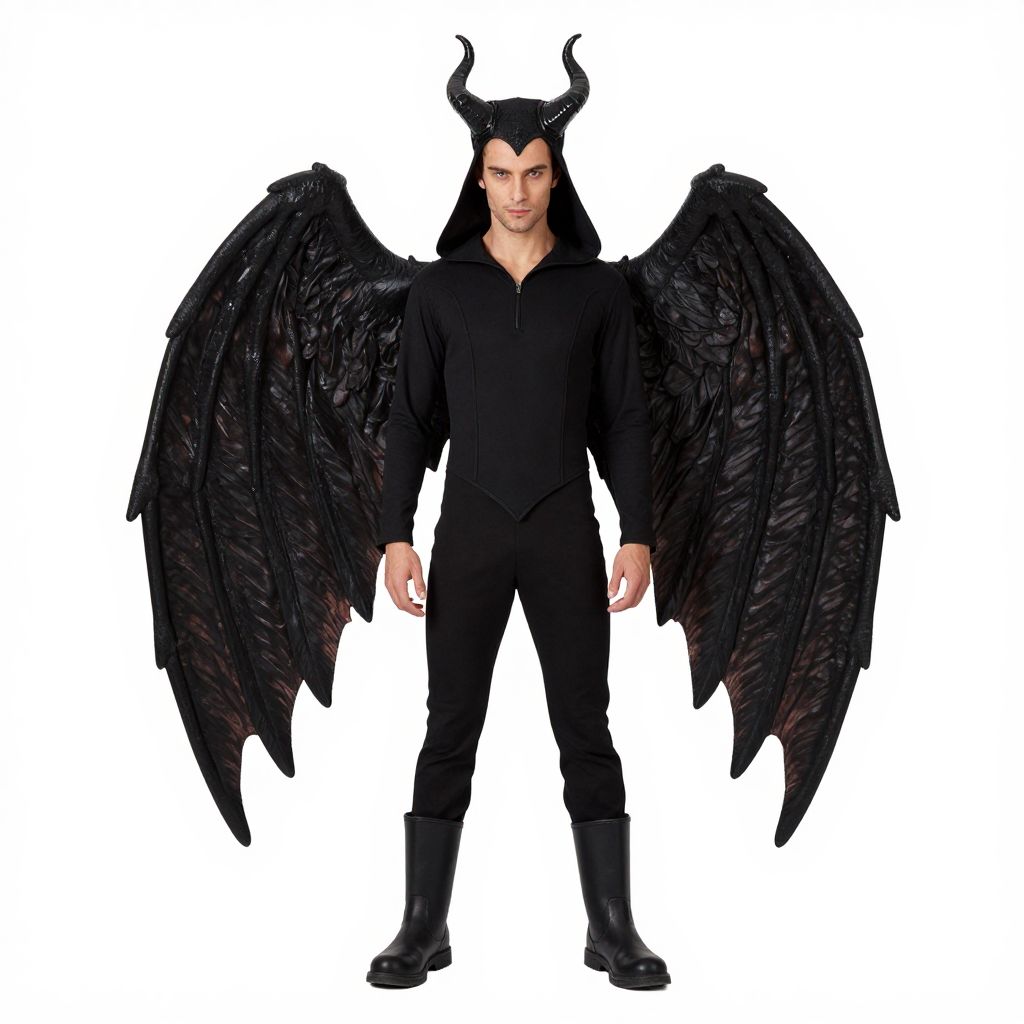 Adult evil fairy costume, solo, wings, horns, male focus, 1boy, standing, full body, boots, hood, demon wings