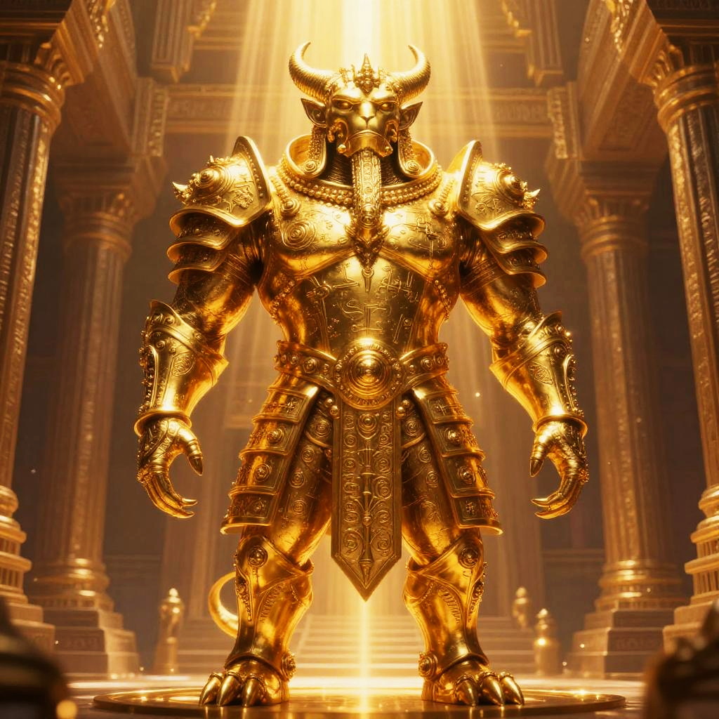 Au generate image with a fantasy theme, a majestic golem forged from pure gold, standing in a grand ancient temple with shimmering light beams, detailed ornate armor with alchemical engravings, radiating warmth and ancient mystical energy.