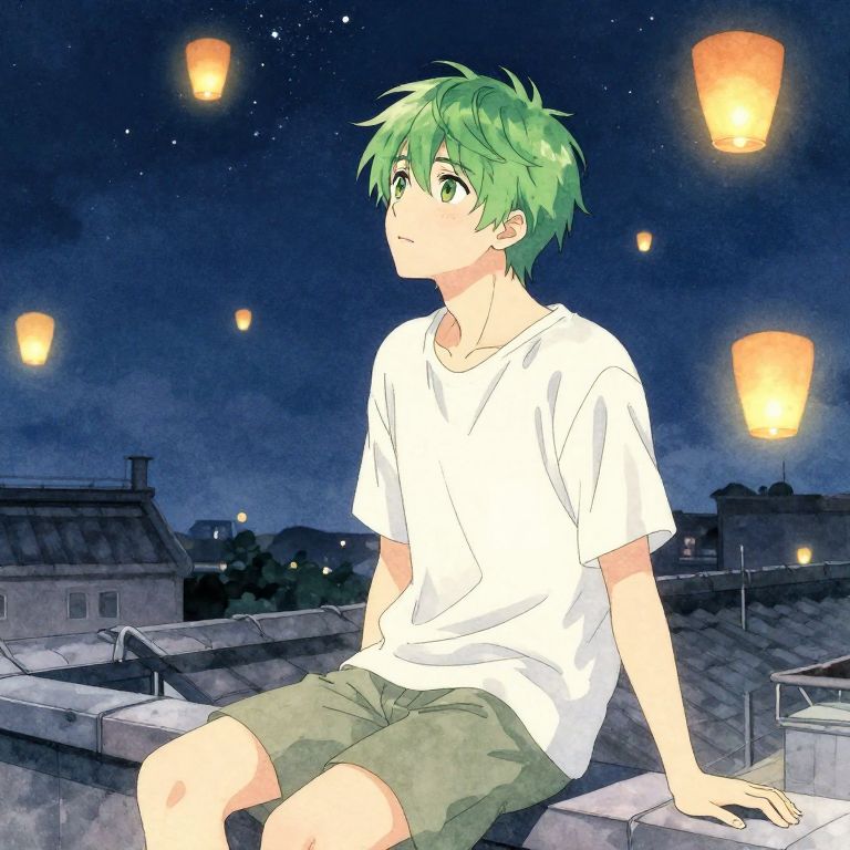 Anime green hair guy, sitting on a rooftop under a star-filled night sky, surrounded by floating lanterns, soft moonlight casting gentle shadows, delicate line art with watercolor texture, expressive eyes reflecting deep thoughts and serenity