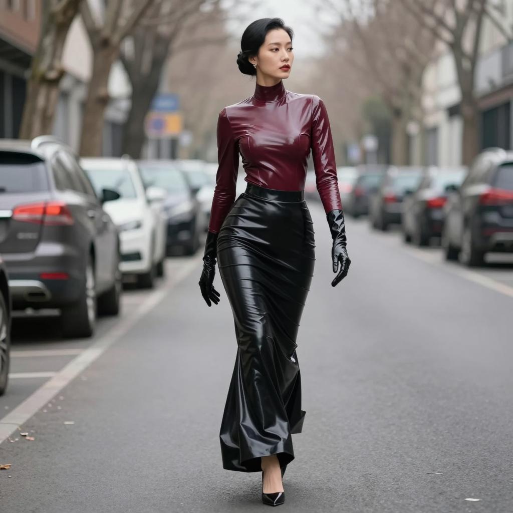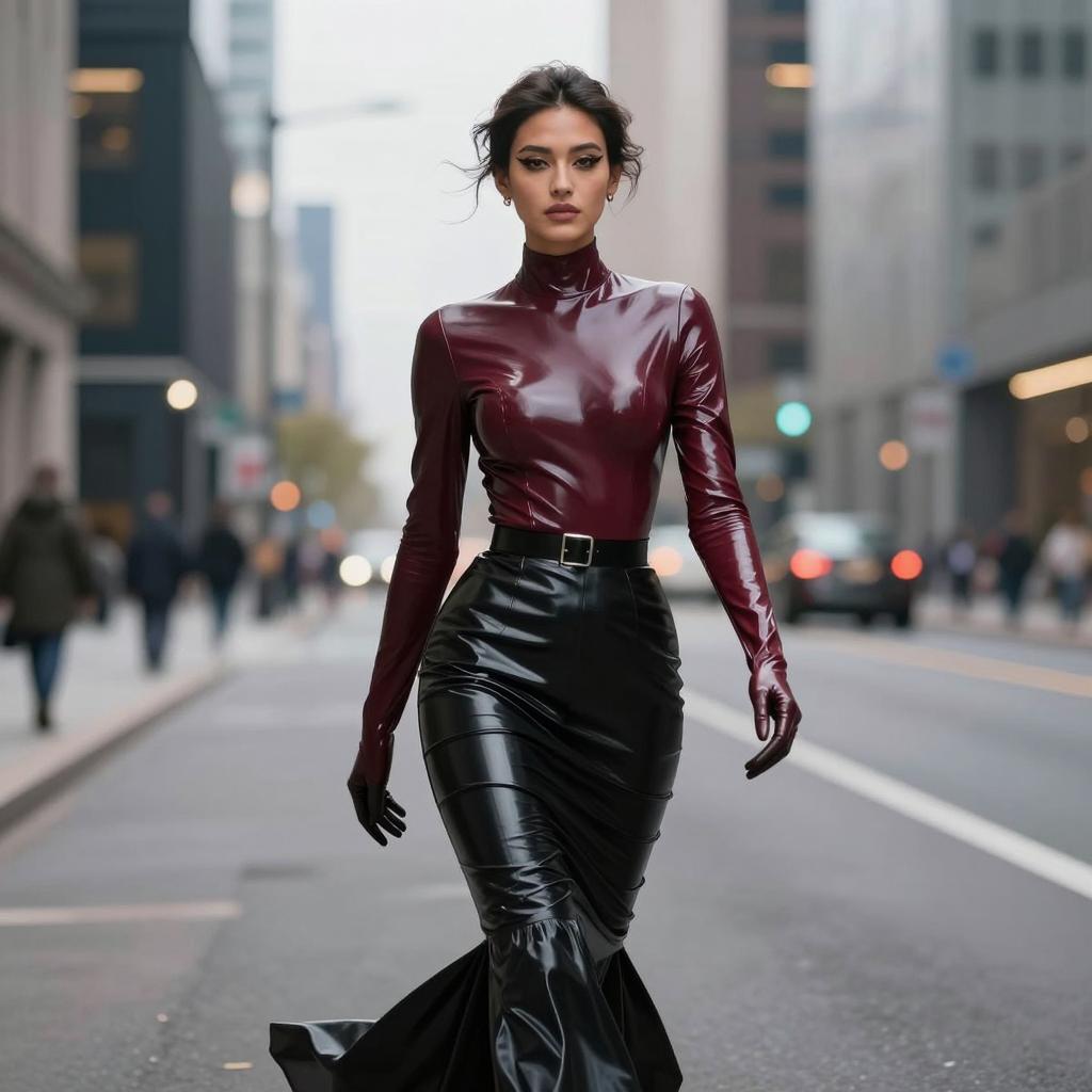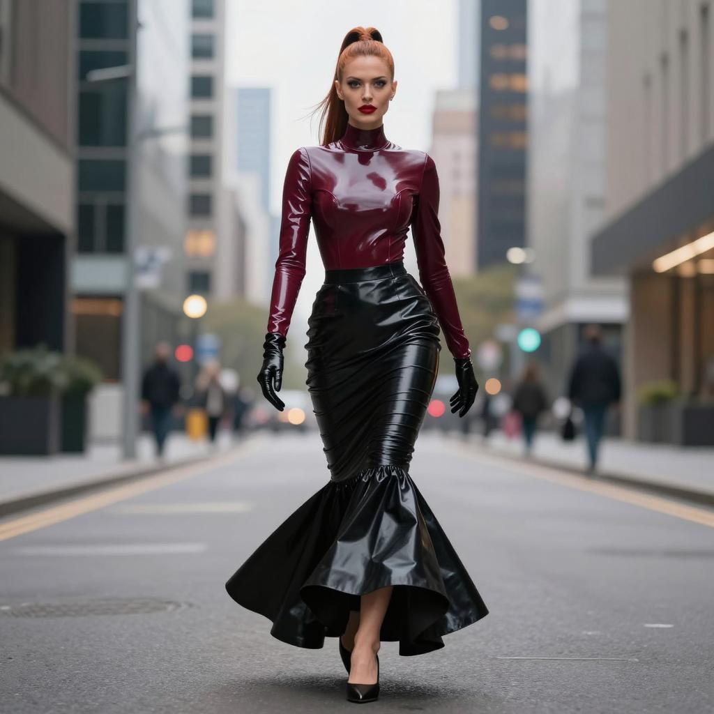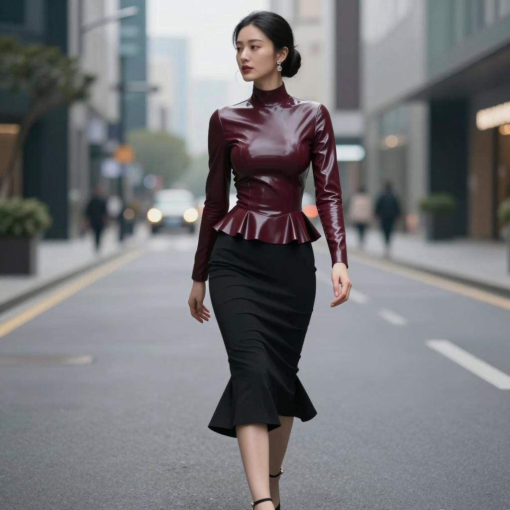 Fetish fashion woman in high-neck latex top and mermaid skirt, black-haired woman with elegant bun and porcelain skin wearing dark cherry latex blouse with flared hem and jet-black pencil skirt with no gloves, wearing delicate drop earrings and ankle-strap heels walking past the camera with subtle over-the-shoulder glance in empty business district at dusk with blurred lights, street fashion photography, overcast daylight, ultra-detailed