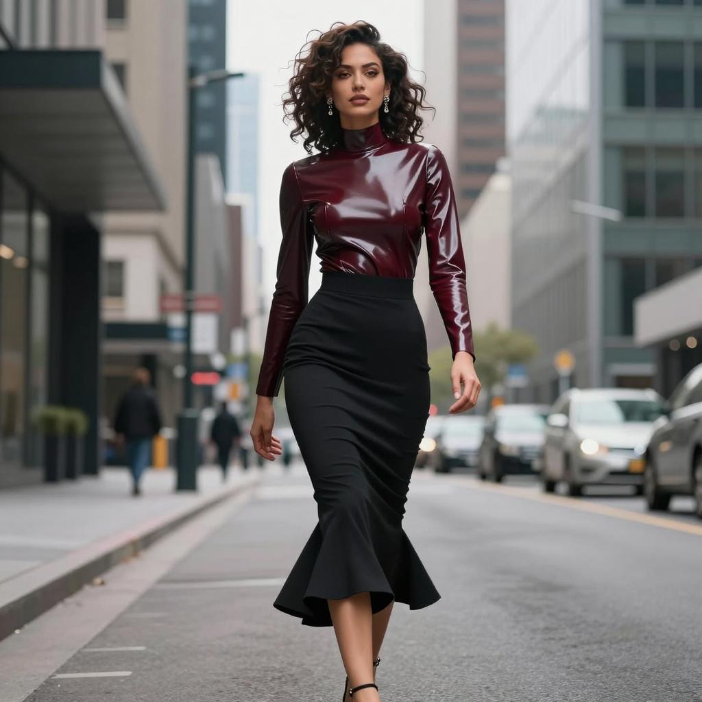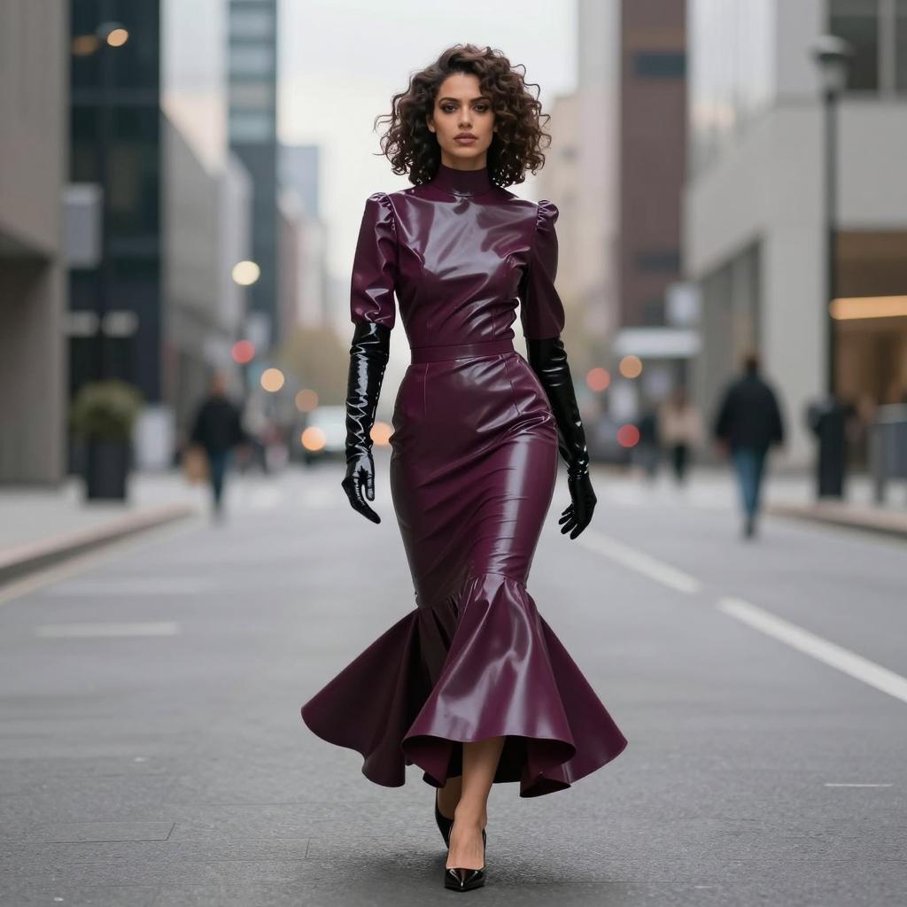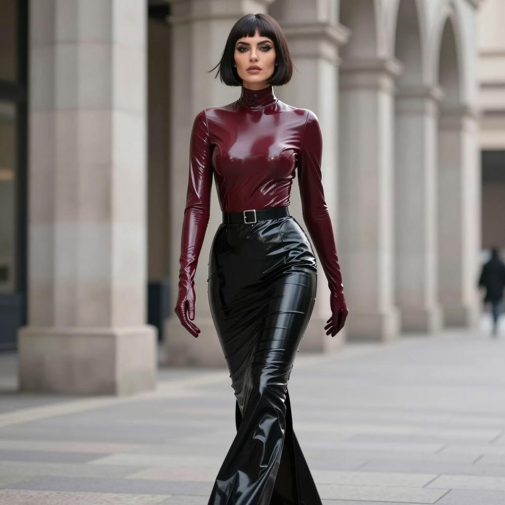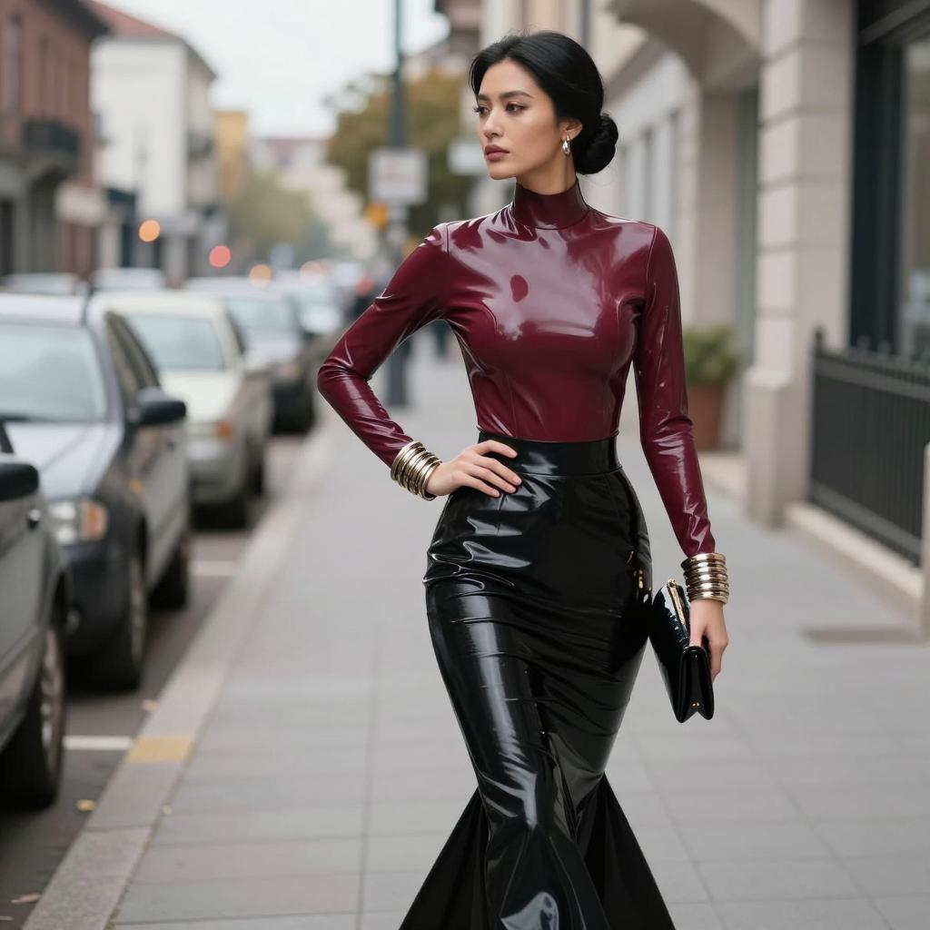 Fetish fashion woman in high-neck latex top and mermaid skirt, black-haired woman with elegant bun and porcelain skin wearing dark cherry latex blouse with flared hem and jet-black pencil skirt with no gloves, wearing delicate drop earrings and ankle-strap heels walking past the camera with subtle over-the-shoulder glance in empty business district at dusk with blurred lights, street fashion photography, overcast daylight, ultra-detailed