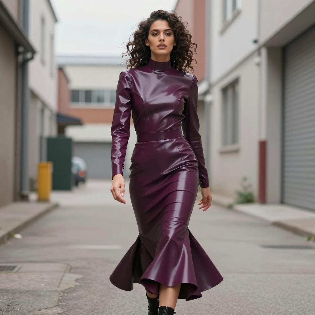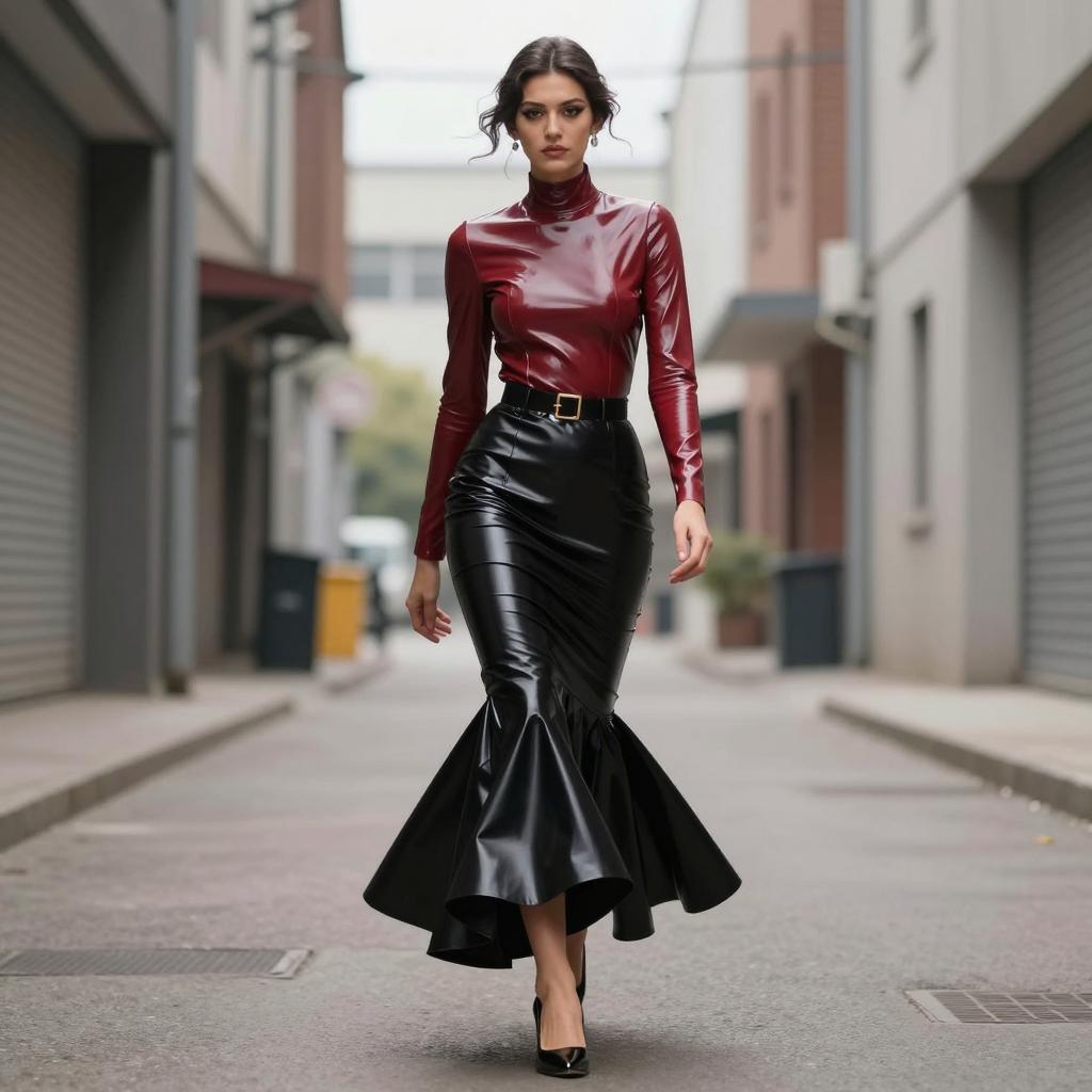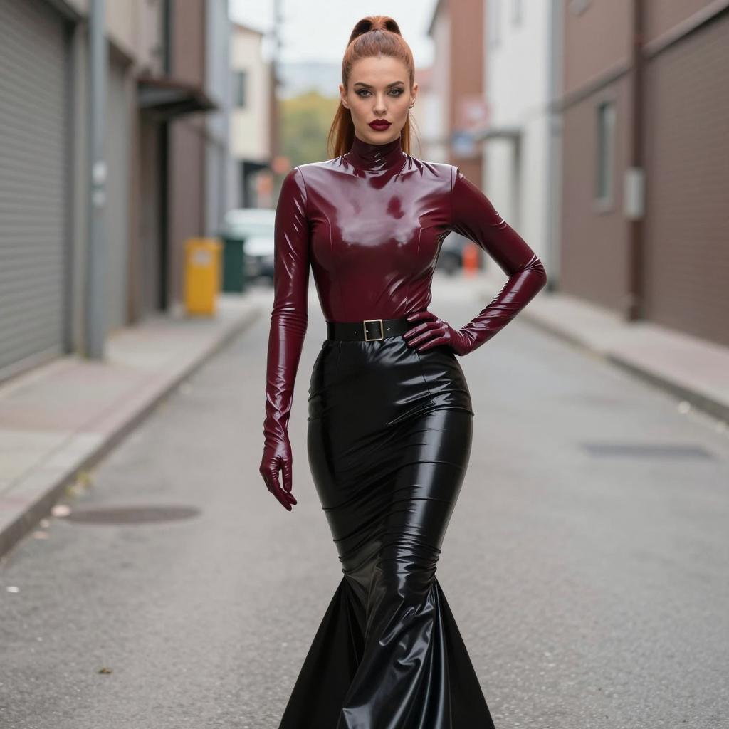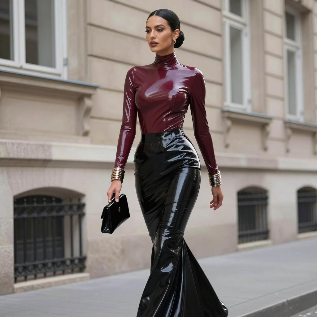 Fetish fashion woman in high-neck latex top and mermaid skirt, black-haired woman with elegant bun and porcelain skin wearing dark cherry latex blouse with flared hem and jet-black pencil skirt with no gloves, wearing delicate drop earrings and ankle-strap heels walking past the camera with subtle over-the-shoulder glance in empty business district at dusk with blurred lights, street fashion photography, overcast daylight, ultra-detailed