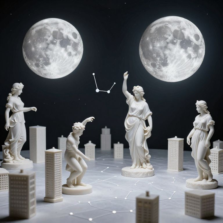 Photograph of four white marble statues of classical-style women with flowing drapery, standing on a glowing, star-patterned platform. The background is a dark, starry night sky with two large, luminous full moons. The statues, arranged in a semi-circle, appear to be interacting with the moons; one statue in the center is pointing upward at a constellation. Surrounding them are various white, rectangular building models. The scene has a surreal, celestial feel, with the glowing platform and moons creating an ethereal light. The women have detailed, elegant features and are positioned in dynamic poses.