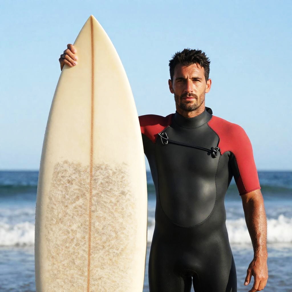 Two men in black wetsuits standing on a sandy beach. Left man holds yellow box, right man holds red surfboard. Both have beards, short hair. Background: grassy dunes. Bright sunlight. Both standing upright.