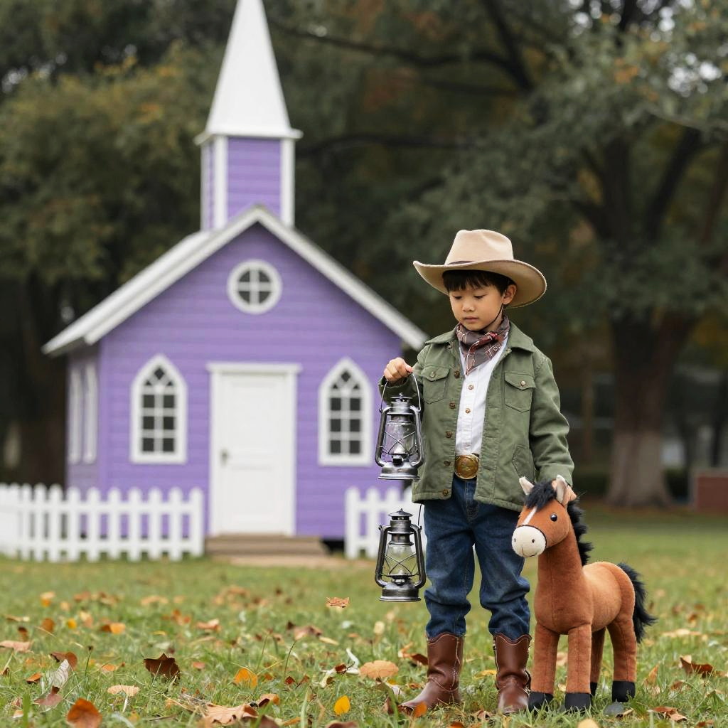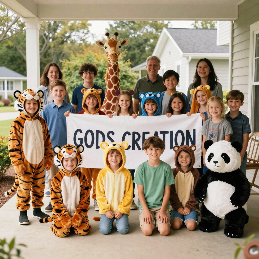 A colorful, cheerful photo of a group of kids, around 15, dressed in various animal costumes like tigers, giraffes, bears, and pandas, standing and kneeling in front of a white banner that reads "GOD'S CREATION." They're smiling and posing on a porch with adults in the background. The setting is a suburban neighborhood with trees and houses. The kids' costumes are vibrant, adding a playful, festive vibe to the scene.