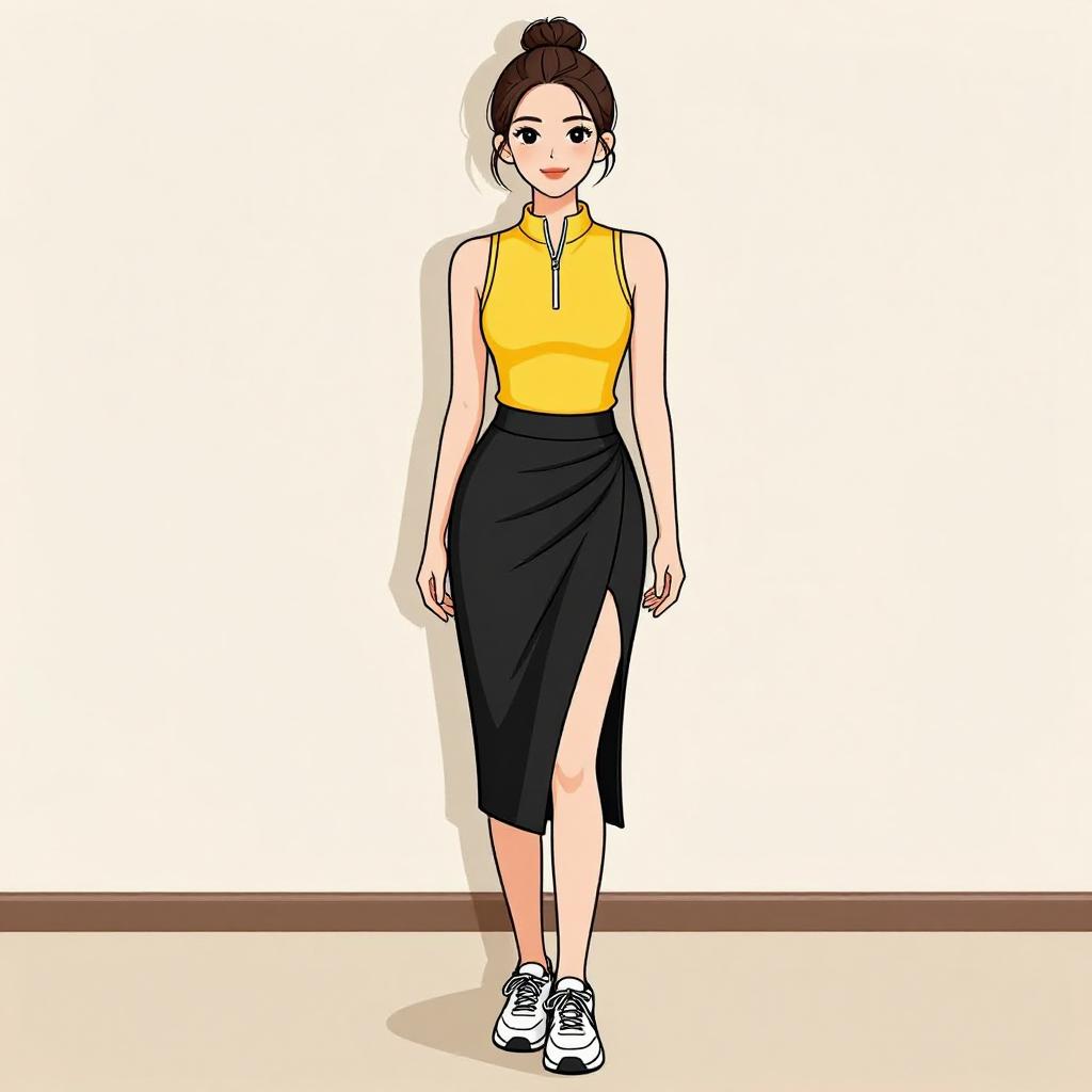Digital drawing of a young Asian woman with fair skin and dark brown hair in a bun. She wears a sleeveless, high-necked, bright yellow top and a black, high-waisted, knee-length skirt with a left thigh-high slit. She has black eyes, a small smile, and is standing with a relaxed posture. She wears white sneakers with black laces. The background is plain white with a brown baseboard at the bottom. The image uses bold colors and clean lines, typical of digital illustration styles.