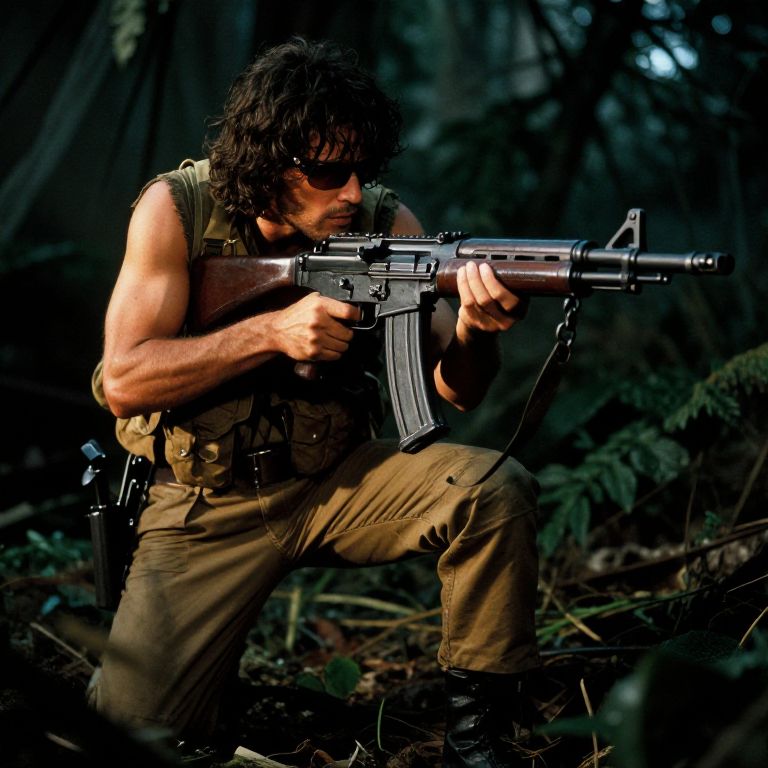 M60 machine gun Rambo mid-action, intense close quarters battle, thick foliage around, aggressive stance, detailed weapon textures, dramatic shadows, 80s action film inspired