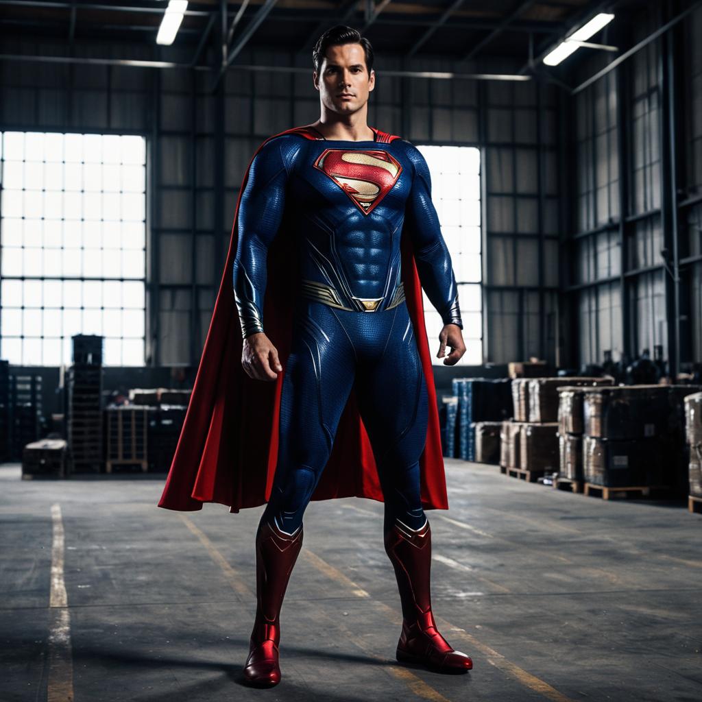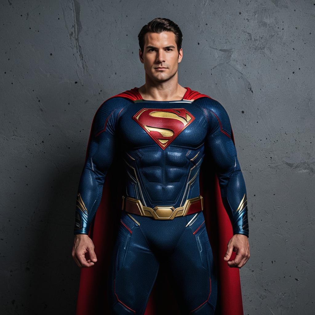 Man superhero costume, photorealistic, full-body portrait of a muscular man in a Superman suit, standing against a gray ured wall, serious expression, short brown hair, blue and red suit with gold accents, red Superman emblem on chest, red belt with blue and gold details, digital art, detailed ures, realistic lighting, slightly smoky background, CGI style