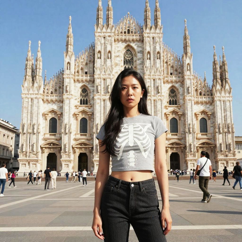 Photograph of an Asian woman with long black hair, wearing a black "Immortal" skull tank top and ripped jeans, standing on a rooftop terrace