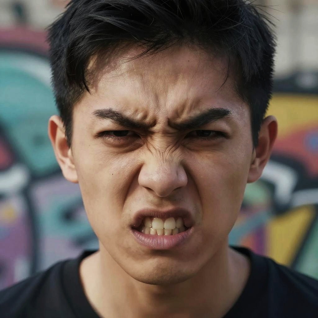 Enfadada face close-up, furrowed brows, clenched jaw, dark shadows emphasizing anger, urban graffiti backdrop, high detail