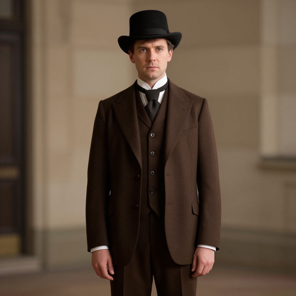 "Victorian Man Dress, man in a brown suit and hat posing for a picture"