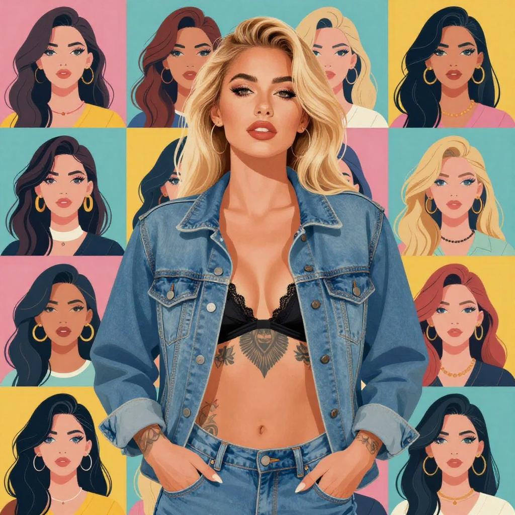 A digitally illustrated blonde woman poses confidently in a partially open blue denim jacket, revealing a detailed tattoo on her torso. Behind her is a grid of vibrant, stylized portraits of various women, showcasing a modern pop art aesthetic with bold lines and contrasting colors.