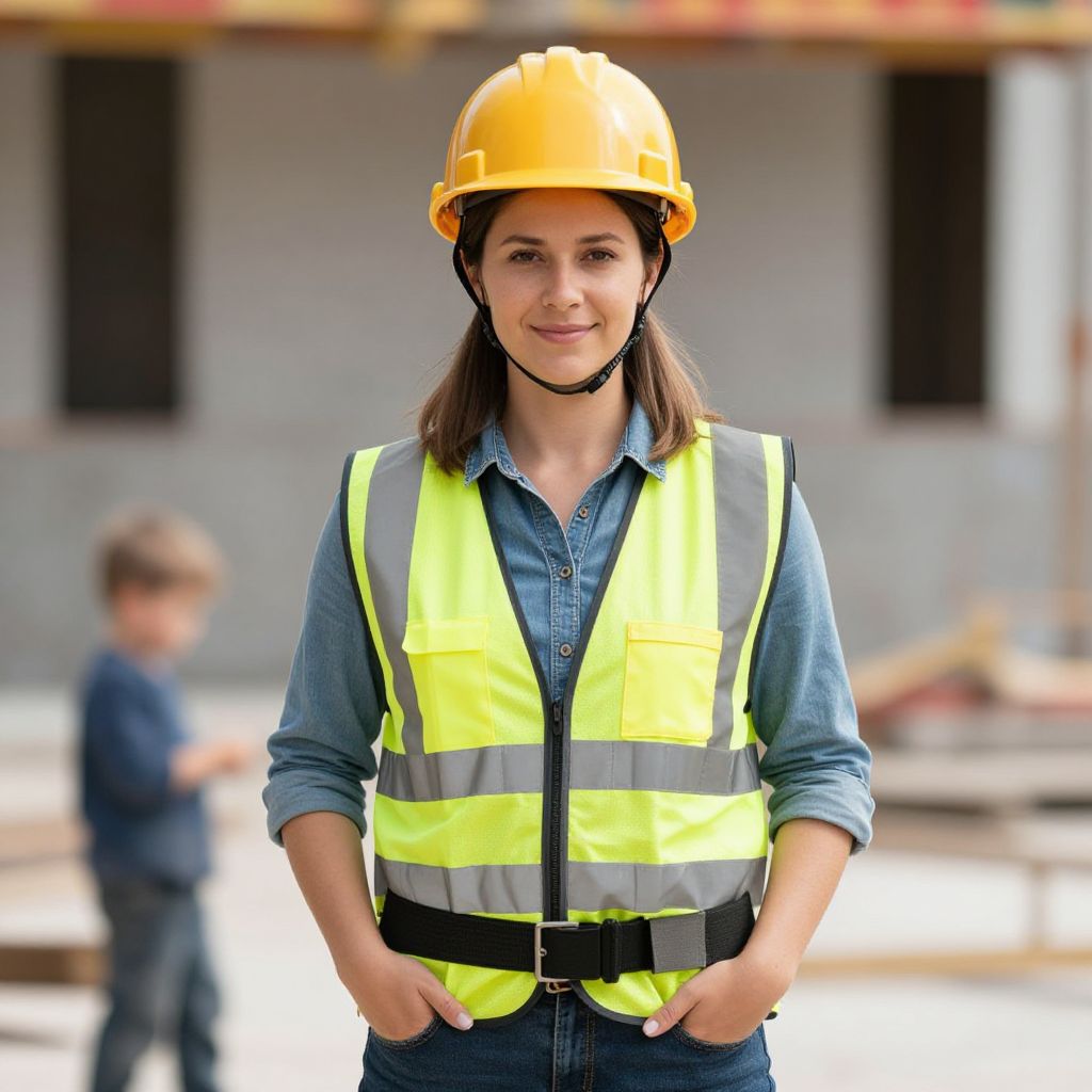Photograph of a smiling woman with light skin and brown hair, wearing an orange hard hat, bright yellow reflective safety vest, and blue denim shirt. She stands with hands in her vest pockets in front of a blurred construction site background, featuring a young boy in blue clothes to the left. The construction site includes gray walls, wooden beams, and scaffolding. The woman's vest has gray reflective stripes and a black strap at the waist. The image has a sharp focus on the woman and a soft focus on the background.