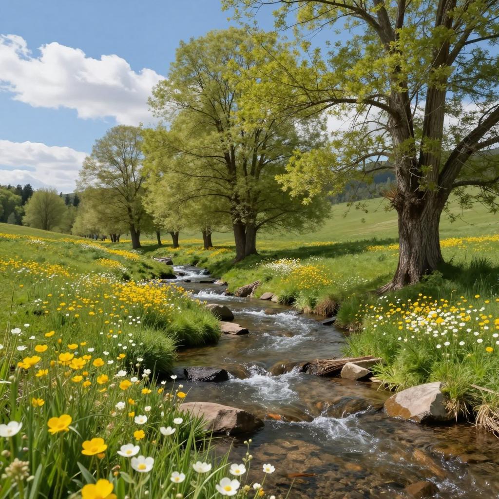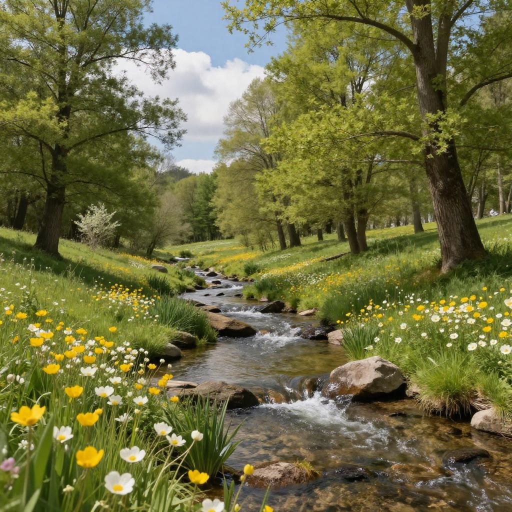 A serene natural landscape featuring a clear stream gently flowing through a vibrant green meadow adorned with yellow and white wildflowers. Tall trees with light green foliage border the meadow under a blue sky with scattered clouds, creating a peaceful and idyllic springtime scene.