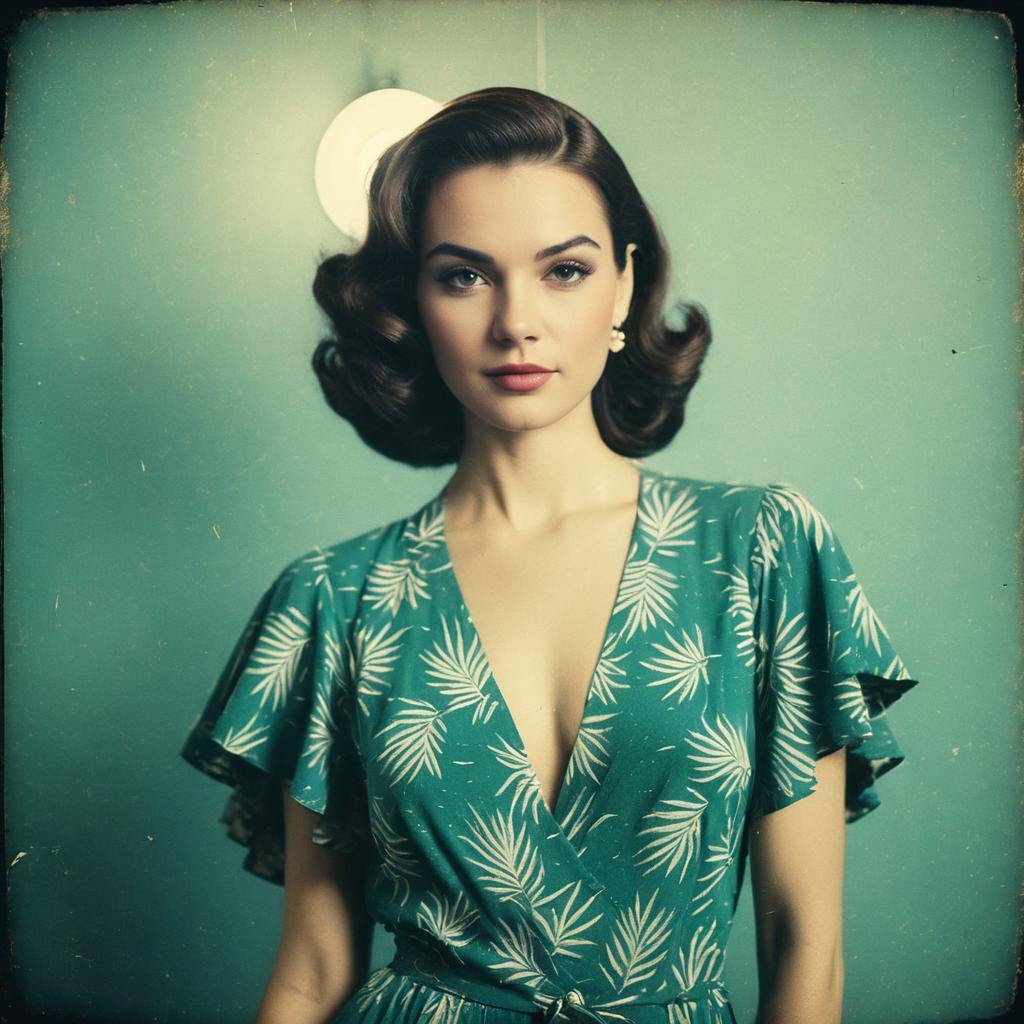 Portrait of a young woman with medium-length brown hair styled in vintage waves. She is wearing a bold green romper featuring a white palm leaf print, deep V-neckline, short flutter sleeves, and a cinched waist. The background is a solid muted teal color, with a soft vintage filter over the image. The woman's makeup is bold, complementing her polished boho look.