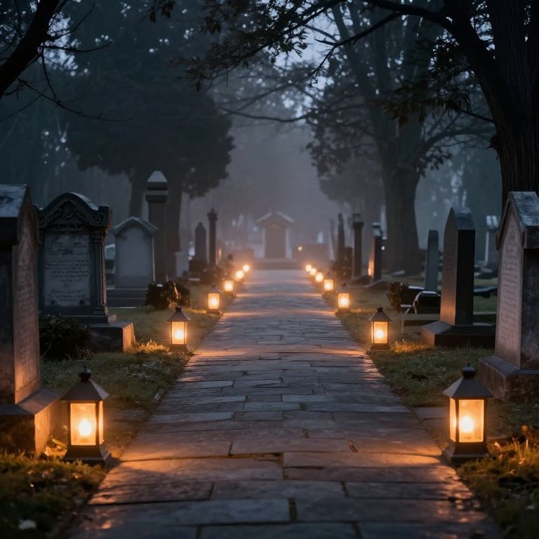 Lanterns lined along a stone pathway emit warm, flickering light, casting an ethereal glow over a serene cemetery scene framed by misty trees and ornate tombstones.
