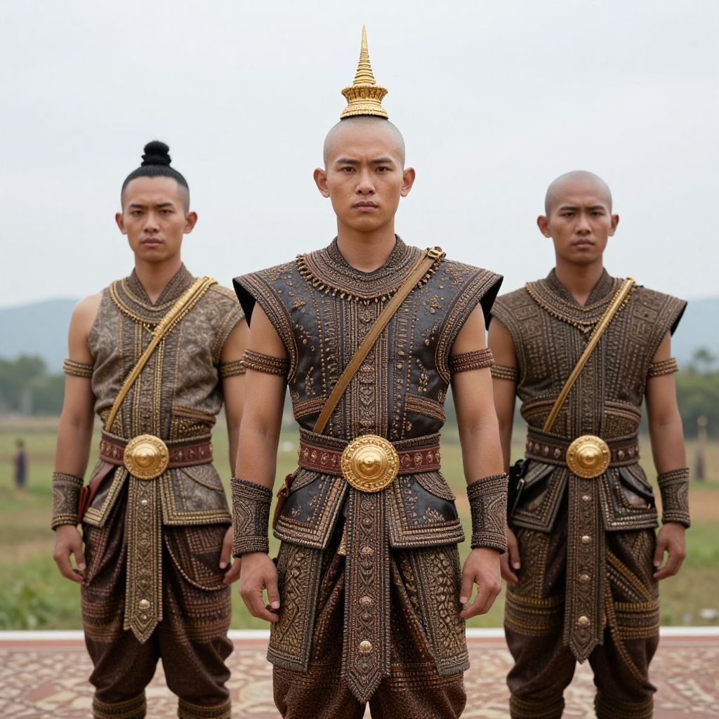 Matte portrait of smart 30 thai armored warlords who assemble in a beautiful battlefield landscape, ethenic costume, brerdless face, historical hero, ethnic group, intricate, tai costume, t