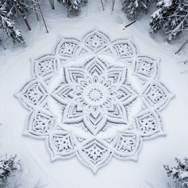 A snow-covered mandala with intricate patterns, set against a winter landscape with a snowy forest.