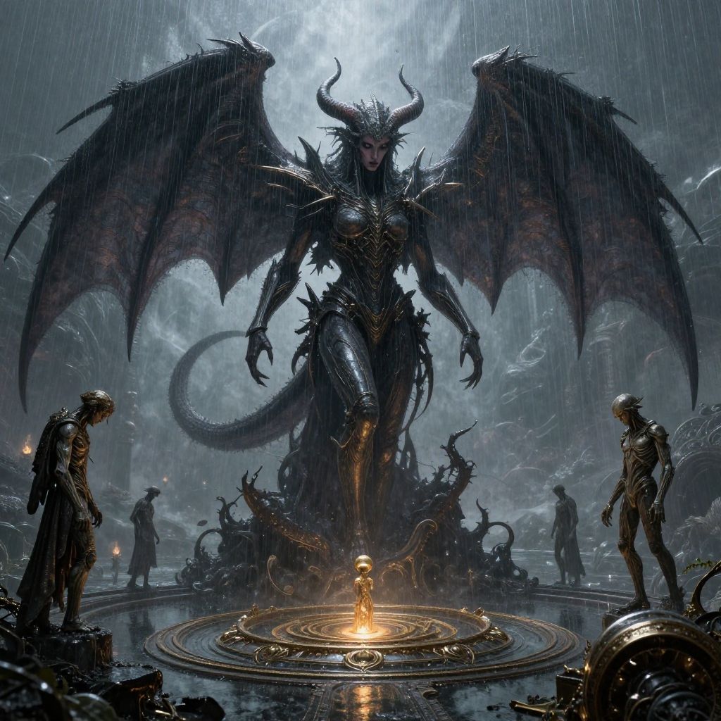 This digital art piece depicts a towering, dark, demonic queen with massive black wings, sharp horns, and a serpentine tail. She stands in the center, glowing with an orange light emanating from a circular ritualistic formation on the wet, rain-slicked ground. Her armor is spiked and metallic, reflecting the dim, stormy sky. Surrounding her are smaller, dark-robed figures, including two on either side of the ritual circle, watching with hooded faces. The background is a misty, gloomy landscape with dark, jagged rocks and distant, barely visible structures. The image has a high-contrast, fantasy-horror style with a dark, moody color palette dominated by blacks, grays, and the orange glow.