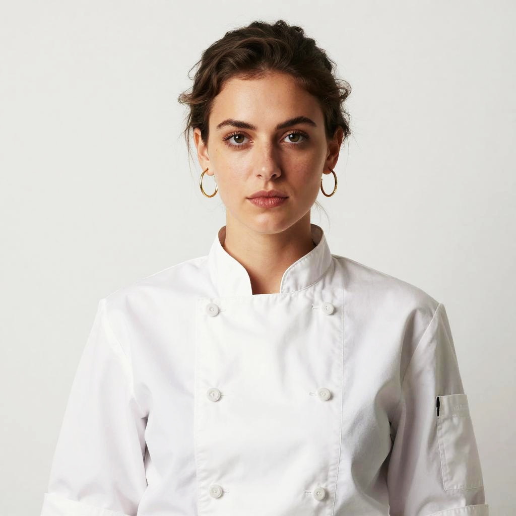 A professional photographic portrait of an attractive young female chef, wearing chef jacket and gold hoop earrings, with perfect eyes and slim body, white background, photographed by Tim Walker, 4K