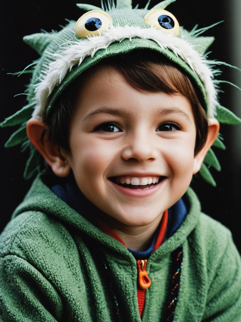 Child in Pascal Costume, close-up cheerful headshot, photorealistic realism