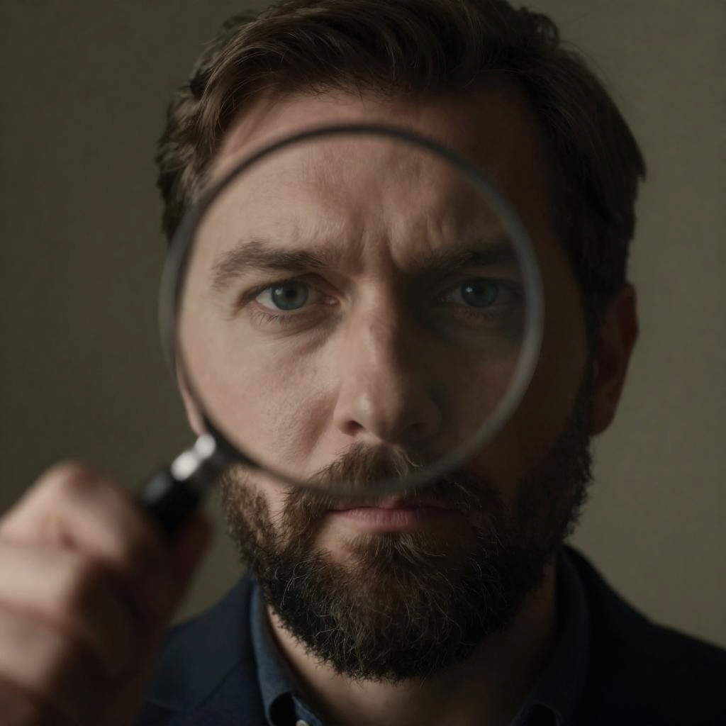 Photograph of a man with short brown hair, blue eyes, and a beard, covering his mouth with his right hand. He wears a dark blue shirt. Dimly lit background with a wooden column on the left. His expression is contemplative.