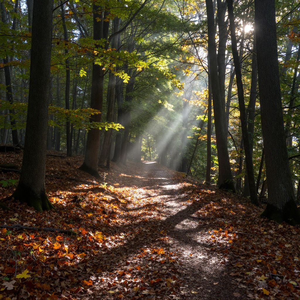 Forest with sunlight piercing the canopy, casting dynamic beams on a winding path strewn with colorful autumn leaves, detailed shadows and highlights on tall trees, a misty background, rich textures of bark and foliage, evoking tranquility and natural beauty
