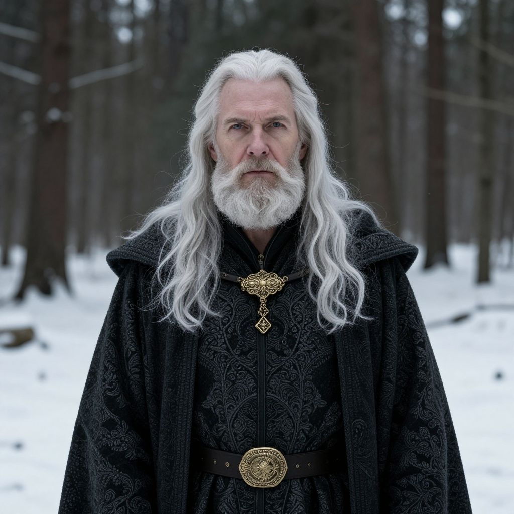 A photograph of an older white man with long, flowing white hair and a full white beard standing in a snowy forest. He's wearing a dark, intricately patterned cloak with a high collar and a large, ornate gold belt buckle. His serious expression contrasts with the muted, wintry background of tall, dark trees and snow-covered ground. The overall vibe is medieval and mystical.
