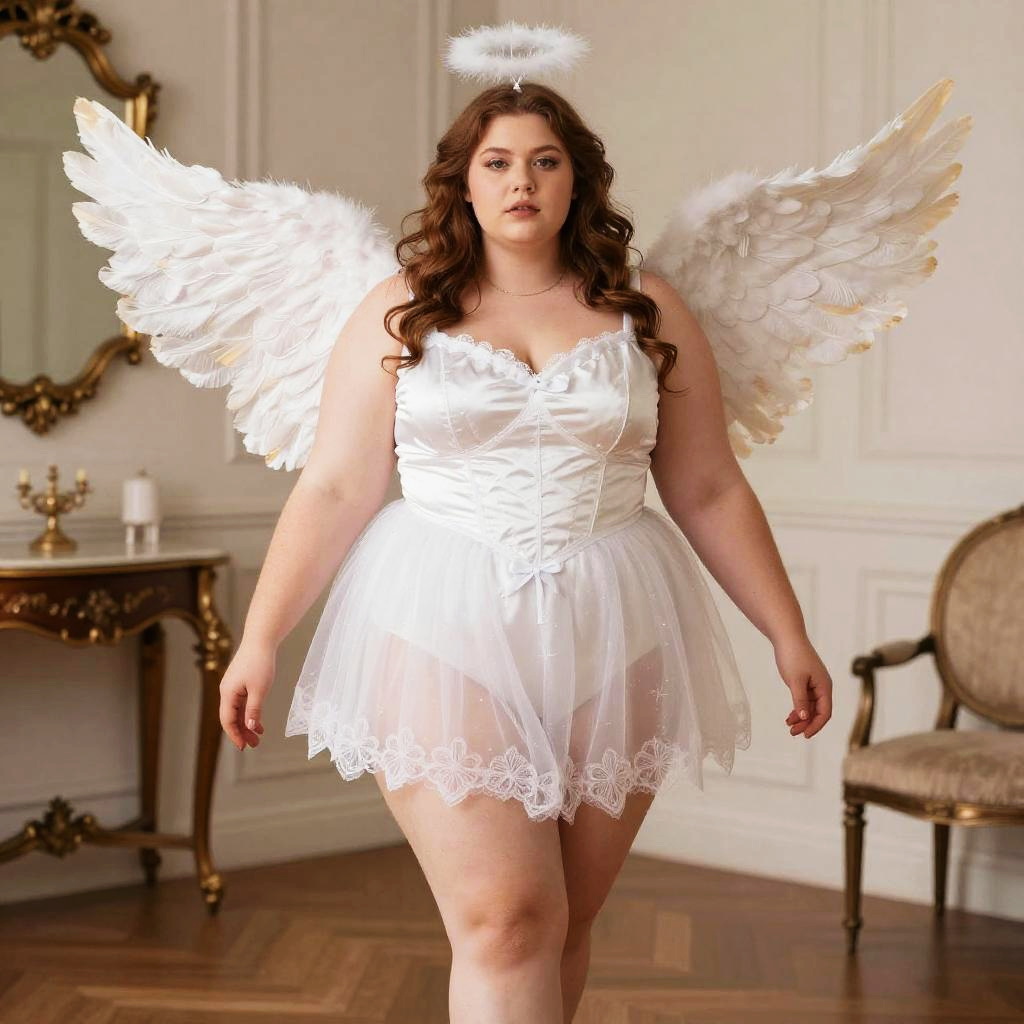 Plus Size Cupid Costume, woman dressed as an angel standing in a room
