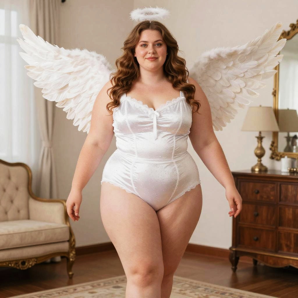 Photograph of a plus-sized woman with long brown curly hair, wearing a white lace-trimmed angel costume with a halter top and short tulle skirt. She has large, white feathered wings and a small, glowing white halo above her head. She stands in an elegant, white-walled room with wooden parquet flooring, a gold-framed mirror, a vintage wooden table with a candlestick, and a classic upholstered chair. The room is softly lit, highlighting her white costume and the intricate details of her wings and halo. The overall style is whimsical and serene.