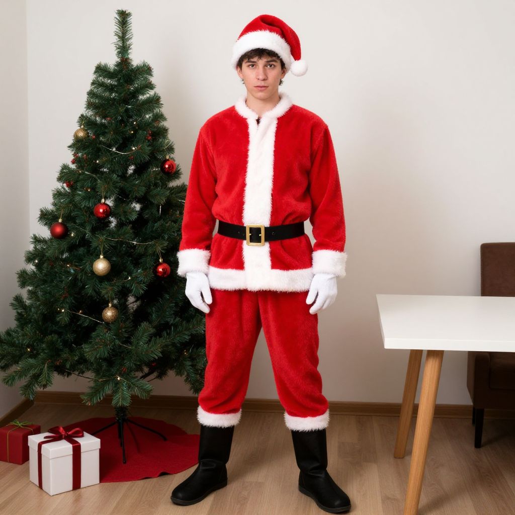 "santa elf costume adult, 1boy, male focus, solo, hat, santa hat, realistic, belt, looking at viewer, christmas, santa costume, pants Realistic photo of casual sexy person with pretty face"