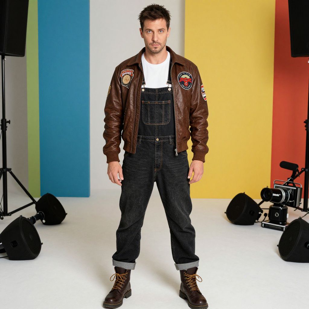 A man, black denim overalls, brown leather bomber jacket, vintage patches, dark brown combat boots, bright soundstage, colorful backdrops, scattered camera equipment, kodak sp analog photo, confident expression Man has masculine face and piercing eyes
