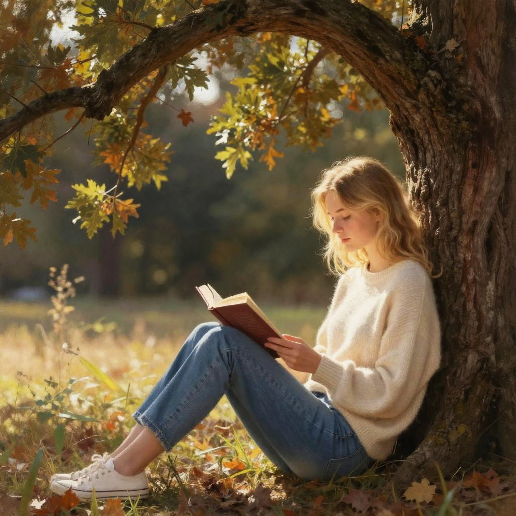 Flat chest blonde girl reading a book under an old oak tree, wearing casual jeans and a cozy sweater, sunlight filtering through leaves, warm autumn colors, peaceful and contemplative atmosphere, realistic painting style.