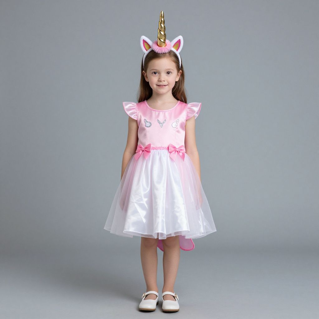 "Unicorn Adult Dress, wearing a pink and white dress with a unicorn horn"