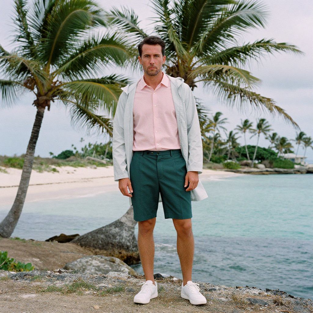 A man, pastel pink short-sleeve button-up, dark green tailored shorts, light gray raincoat, sporty white trainers, standing on a deserted island, palm trees swaying, turquoise waters surrounding, chromogenic film style, relaxed expression. Man has masculine face and piercing eyes