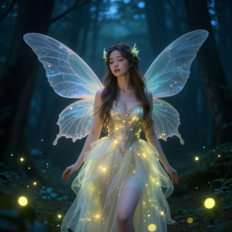 A magical fairy girl with delicate, translucent wings shimmering with soft iridescent hues, wearing a flowing green dress made of woven moss and flowers, standing in a sun-dappled meadow surrounded by blooming wildflowers and floating petals. Her long, silky hair flows gently in the breeze, and her eyes glow with a gentle, sparkling light, giving her a serene and enchanting presence. The background features a dreamy blend of trees and twilight skies, evoking a whimsical, otherworldly atmosphere.