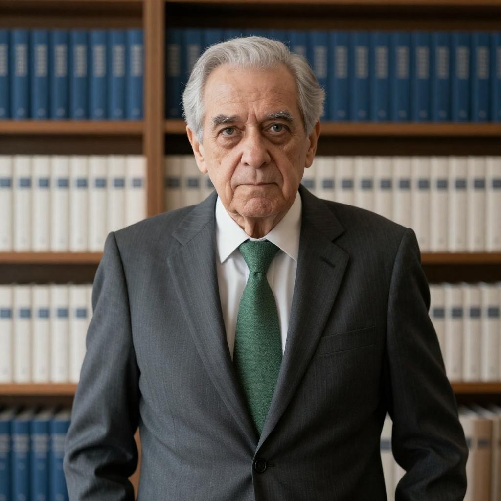 Photograph of a serious-looking man with fair skin, short dark brown hair, and thin-framed glasses. He wears a dark suit with a blue shirt and tie. Blurred red and white background. Close-up, centered, slightly angled.