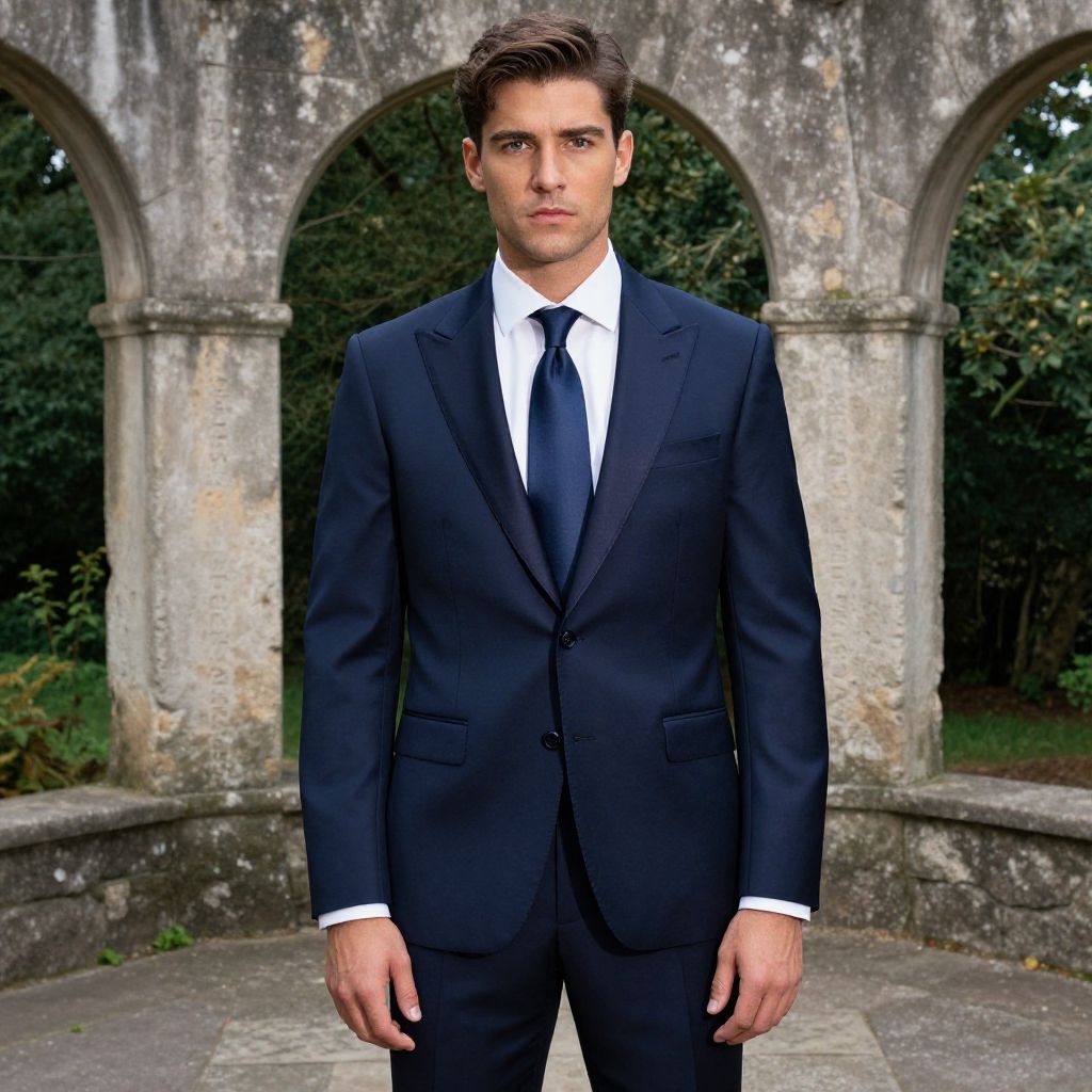 A man, couture formal satin lapel suit, deep navy blue, tailored fit, silk satin lapels, crisp white dress shirt, matching navy silk tie, polished black leather oxfords, ancient stone arches, weathered inscriptions, lush green surroundings, Ilford film stock, confident expression. Man has masculine face and piercing eyes