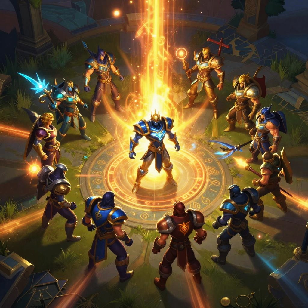 Light league of legends images of a sunlit battleground with legendary heroes surrounded by glowing runes and sparkling light trails, dramatic and vivid artwork.