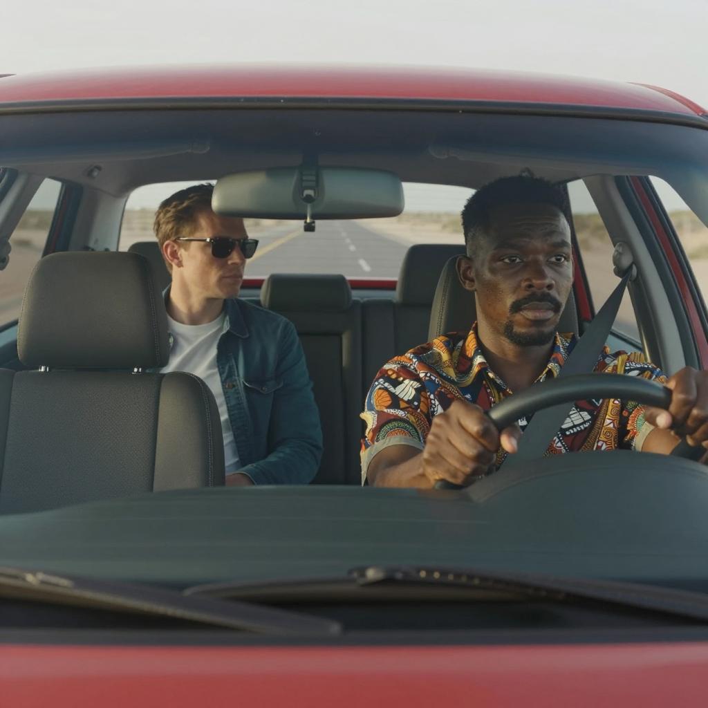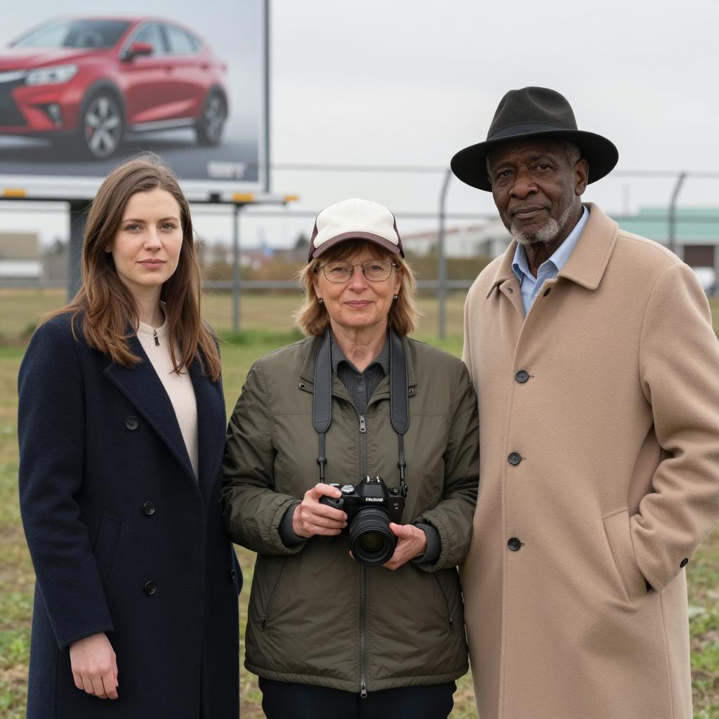 Photograph of three people outdoors. A middle-aged woman with glasses, wearing a white and brown cap, holds a camera. A woman with long brown hair in a dark coat stands left. An older man with dark skin, wearing a black hat and beige coat, stands right. Background includes a billboard with a red car and metal fence. The camera-wearing woman smiles, the other two have neutral expressions. Grass field in the background.