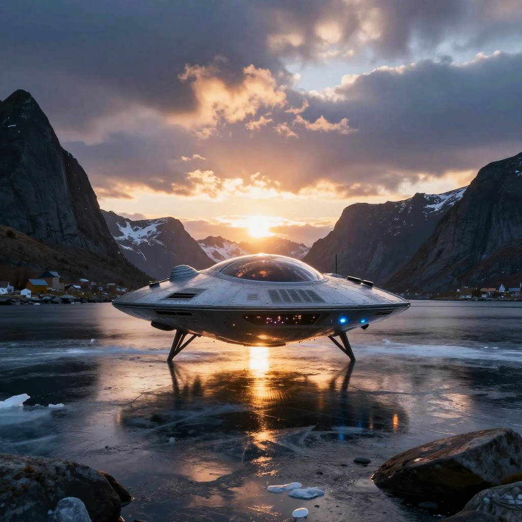 UFO Norway scene depicting an alien craft illuminated by the midnight sun, reflections on icy waters of the fjord, detailed textures on the craft and natural surroundings, ethereal and mystical vibe