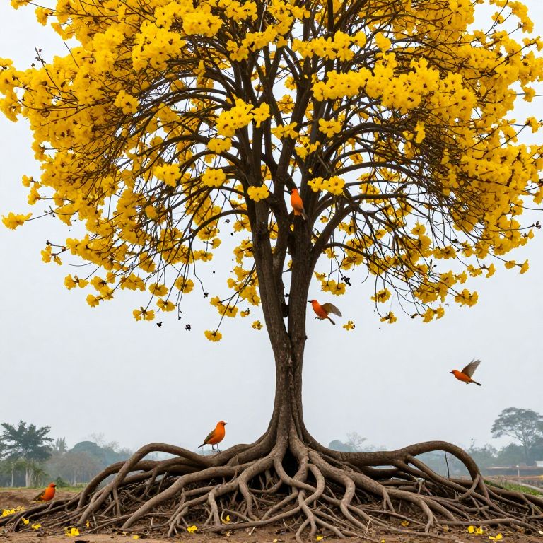 Roots sprawl outward and upward from a dark, textured trunk, forming a complex network above the ground while vibrant orange birds perch and flutter among them, surrounded by delicate yellow blossoms and scattered black seeds.