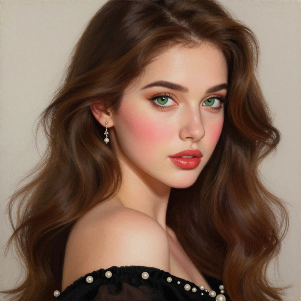 Realistic painting captures a woman with cascading brown hair, accentuated by soft lighting that highlights her vibrant green eyes, rosy cheeks, and glossy red lips, complemented by a delicate earring and a black off-the-shoulder top adorned with pearl embellishments.
