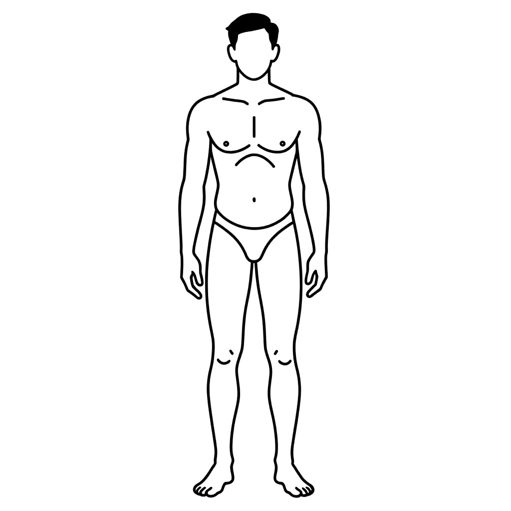 Outline of a male body, minimalistic black line art on white background, anatomical proportions, smooth continuous lines, modern graphic design style